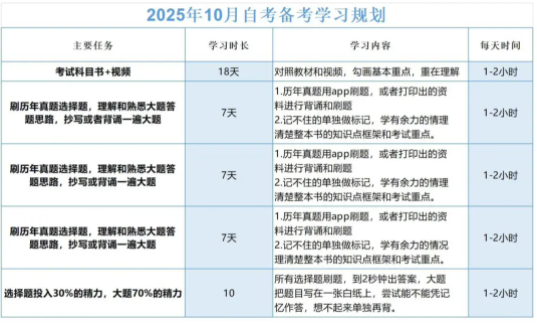 距离下半年自考考试还有48天,考生在这段时间内要做好基本的复习工作,具体备考计划可参考下表进行安排: